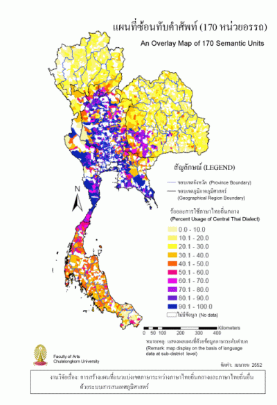 คำอธิบายแผนที่: แผนที่ซ้อนทับคำศัพท์เกิดจากการซ้อนทับชั้นข้อมูลแผนที่เส้นแบ่งเขตคำศัพท์ทั้ง 170 ชั้นเข้าด้วยกันในระบบสารสนเทศภูมิศาสตร์