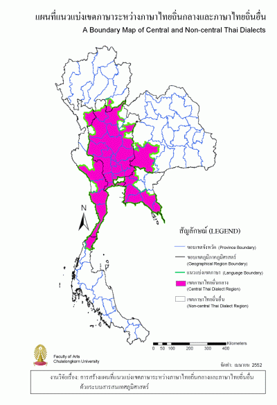 คำอธิบายแผนที่: แผนที่แนวแบ่งเขตภาษาเกิดจากการลากแนวแบ่งเขตภาษาโดยยึดการลากเส้นตามแนวเส้นแบ่งเขตของอำเภอเป็นหลัก ลากแบ่งระหว่างบริเวณที่มีการใช้ภาษาไทยถิ่นกลางตั้งแต่ 50% ขึ้นไปและบริเวณที่มีการใช้ภาษาไทยถิ่นกลางน้อยกว่า 50%