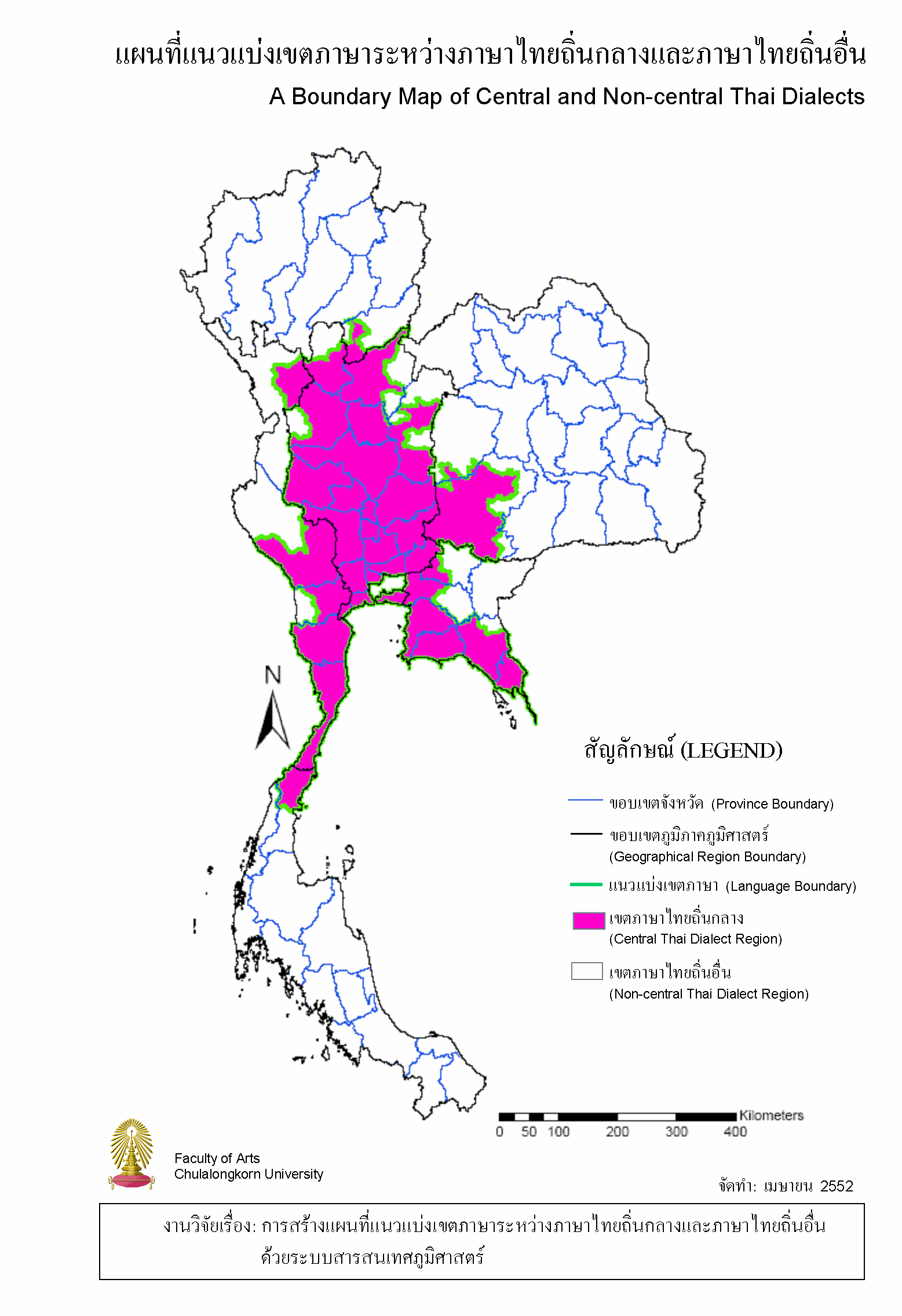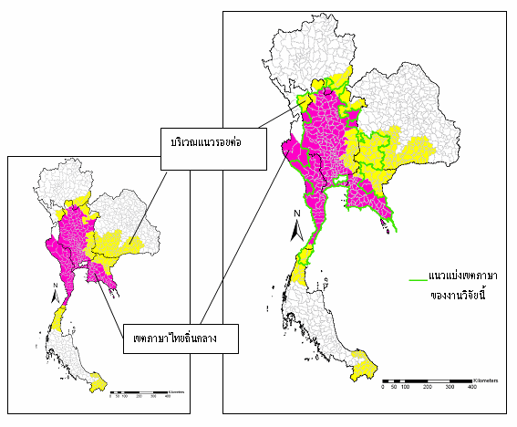 3 ทั้งนี้งานวิจัยของชลิดา ศึกษาโดยใช้คำศัพท์เป็นเกณฑ์ แสดงแนวแบ่งเขตภาษาจากข้อมูลในระดับอำเภอ และครอบคลุมพื้นที่ทั้งประเทศไทยเช่นเดียวกับงานวิจัยนี้ จึงน่าจะสามารถเทียบเคียงกันได้